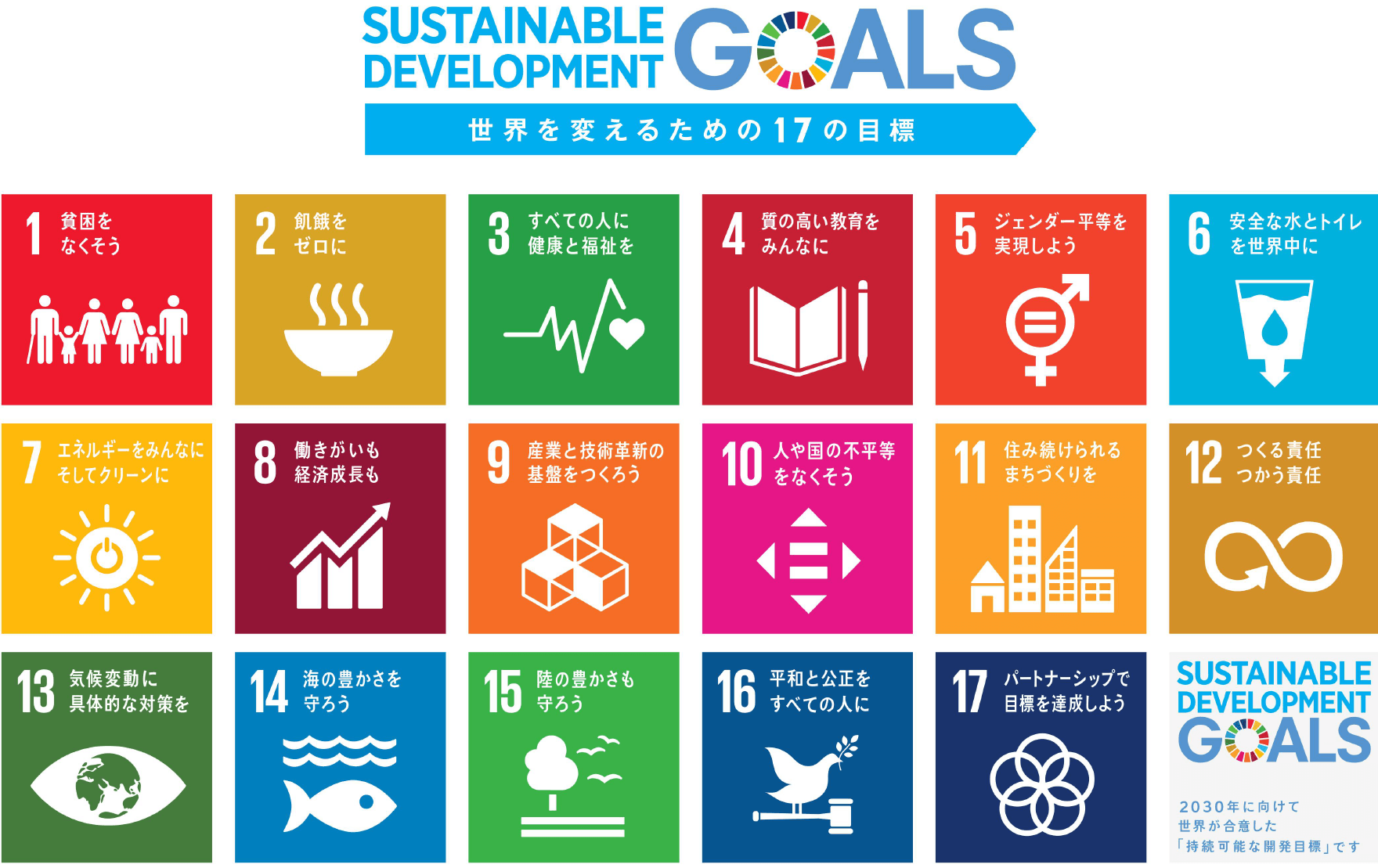 持続可能な開発目標を目指す「SDGs」への参画・取り組みを行っています。2030年までに持続可能でより良い世界を目指すための世界目標として、17のゴール、169のターゲットに向けて活動を行っていきます。